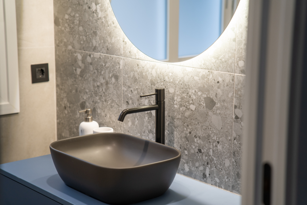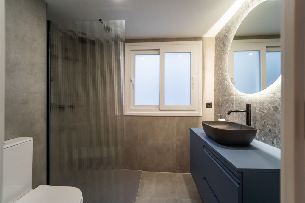 El baño se concibió como un espacio moderno y práctico, con una mampara de vidrio acanalado que aporta privacidad sin bloquear la luz. El mueble de lavabo introduce un toque de color que contrasta con la grifería negra y el espejo retroiluminado, reforzando el lenguaje contemporáneo del conjunto. Para los pavimentos se optó por un porcelánico en la zona de baño y un suelo vinílico en el resto de la vivienda, aportando resistencia y confort.