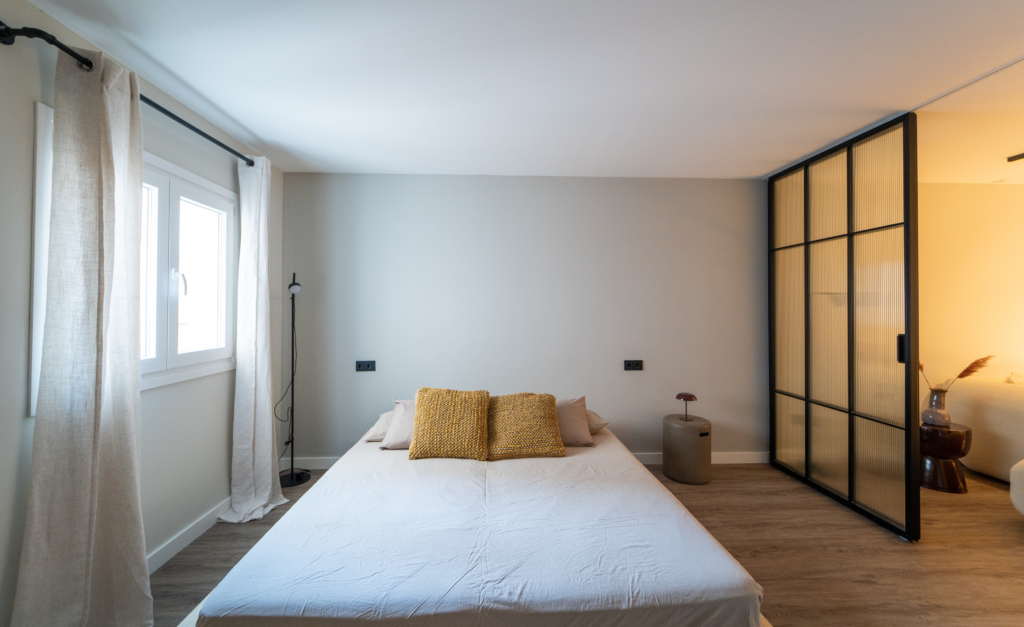 Juan confió en nosotros para transformar una antigua oficina ubicada en el barrio del Soho, en Málaga, en un pequeño apartamento moderno con inspiración industrial. El objetivo era crear un estudio funcional en el que cada centímetro contara, manteniendo la posibilidad de privatizar el dormitorio cuando fuera necesario. Al tratarse de una vivienda totalmente interior, era fundamental potenciar la luminosidad y generar una sensación de amplitud en todo el espacio.