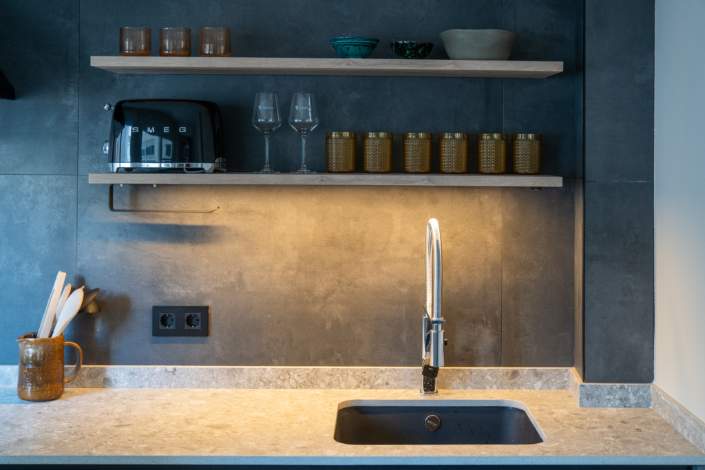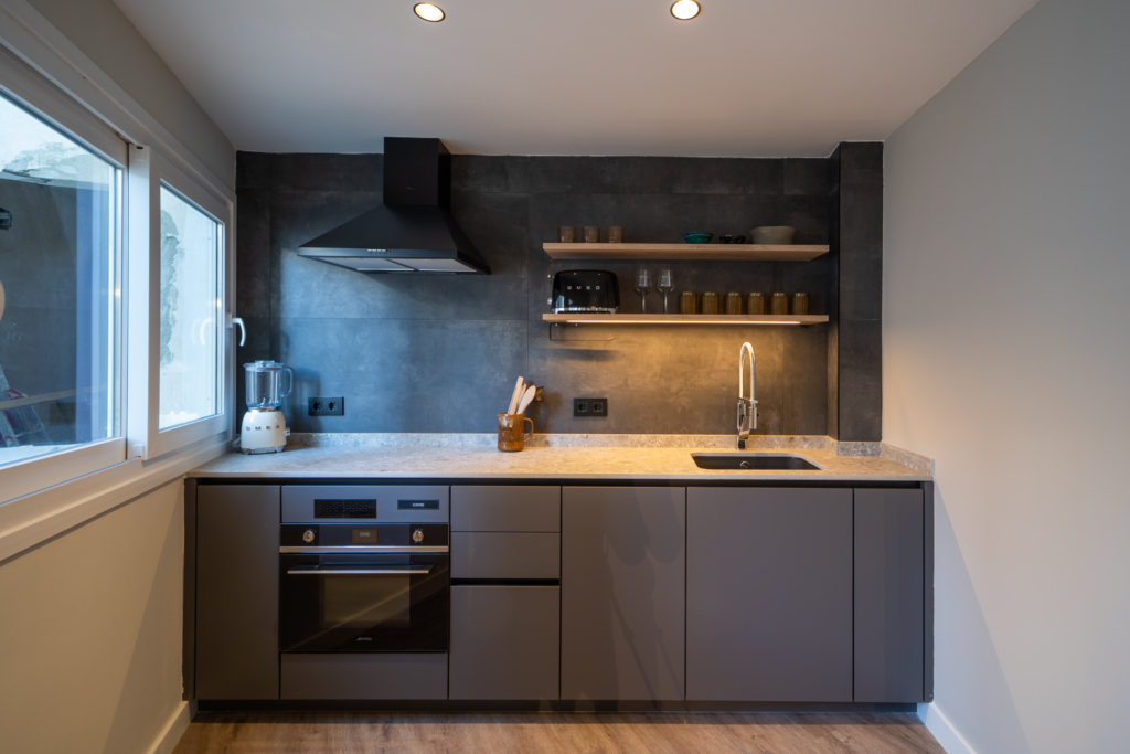 En la cocina se incorporó una placa de cocción oculta bajo la encimera, lo que permite disfrutar de una superficie totalmente continua cuando no se cocina, una solución perfecta para viviendas compactas. El diseño se completa con baldas decorativas retroiluminadas con LED, que añaden profundidad y un carácter cálido dentro del estilo industrial elegido.