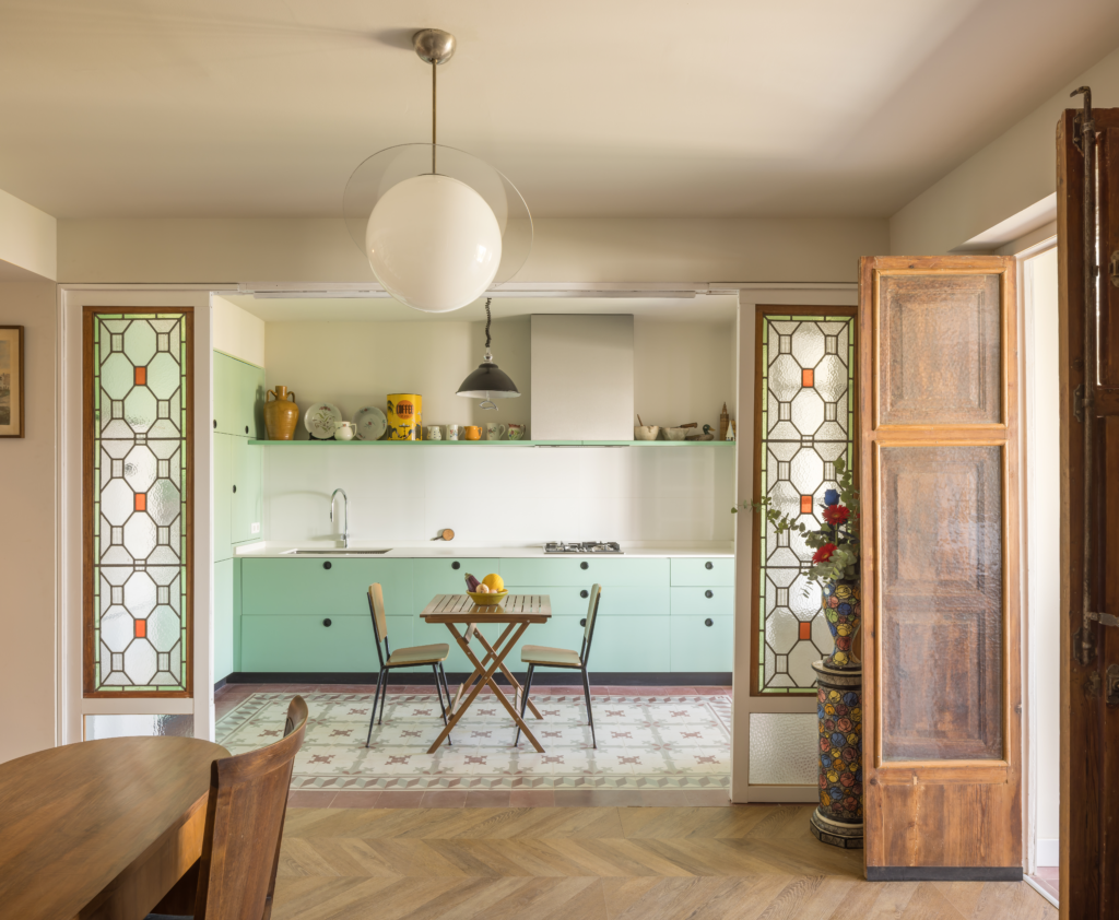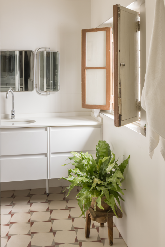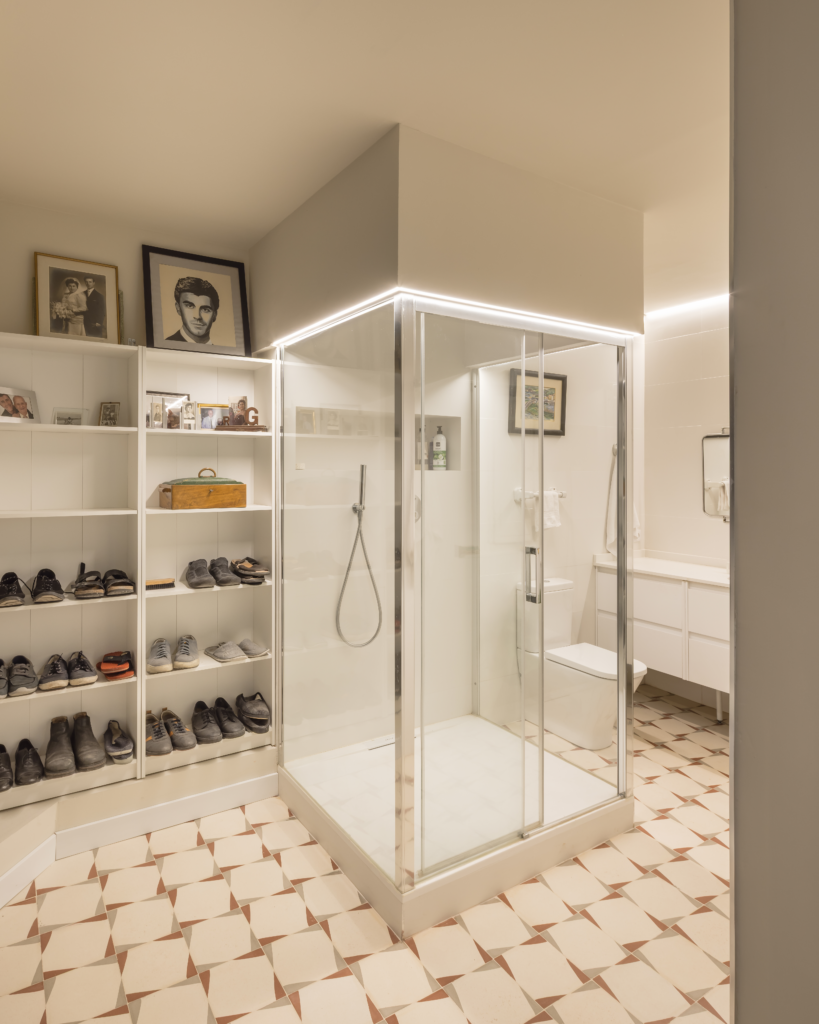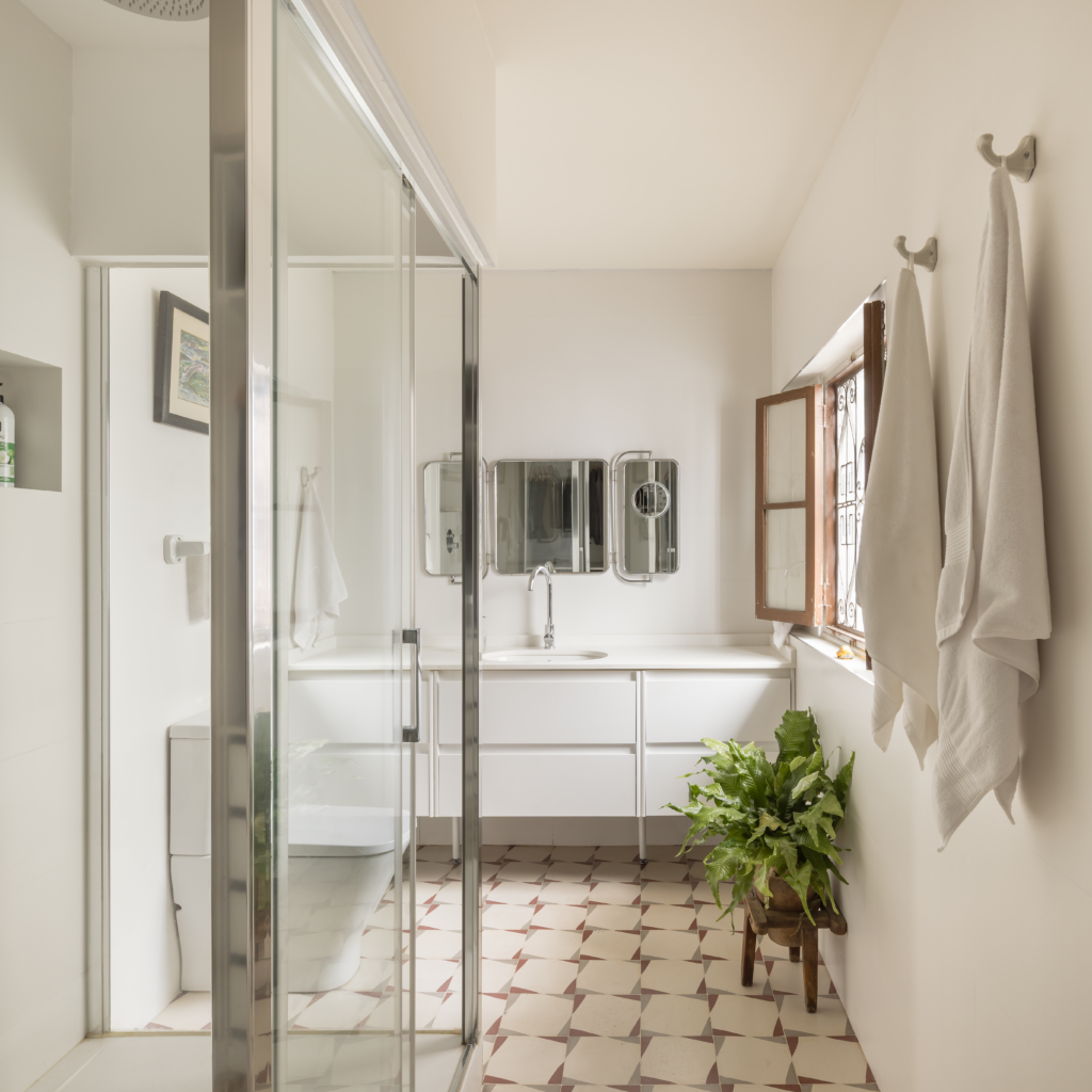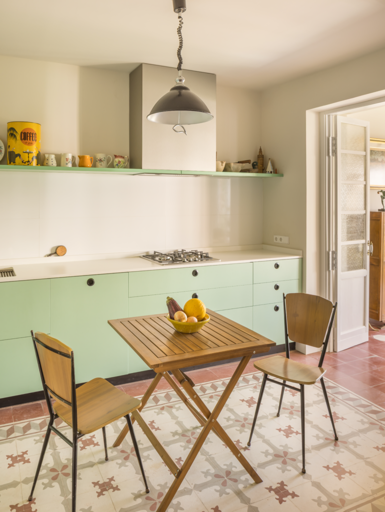 La cocina se diseñó en tonos verdes vivos, en sintonía con los colores del suelo hidráulico recuperado, y se completó con una campana decorativa revestida en melamina efecto acero cepillado y frentes de cocina en color negro con uñeros integrados, aportando un contraste elegante y contemporáneo. En los baños, también con suelos originales, se buscó generar ambientes singulares, siendo el principal parte de un espacio abierto junto al vestidor, que rompe con la compartimentación tradicional y crea una zona versátil e íntima.