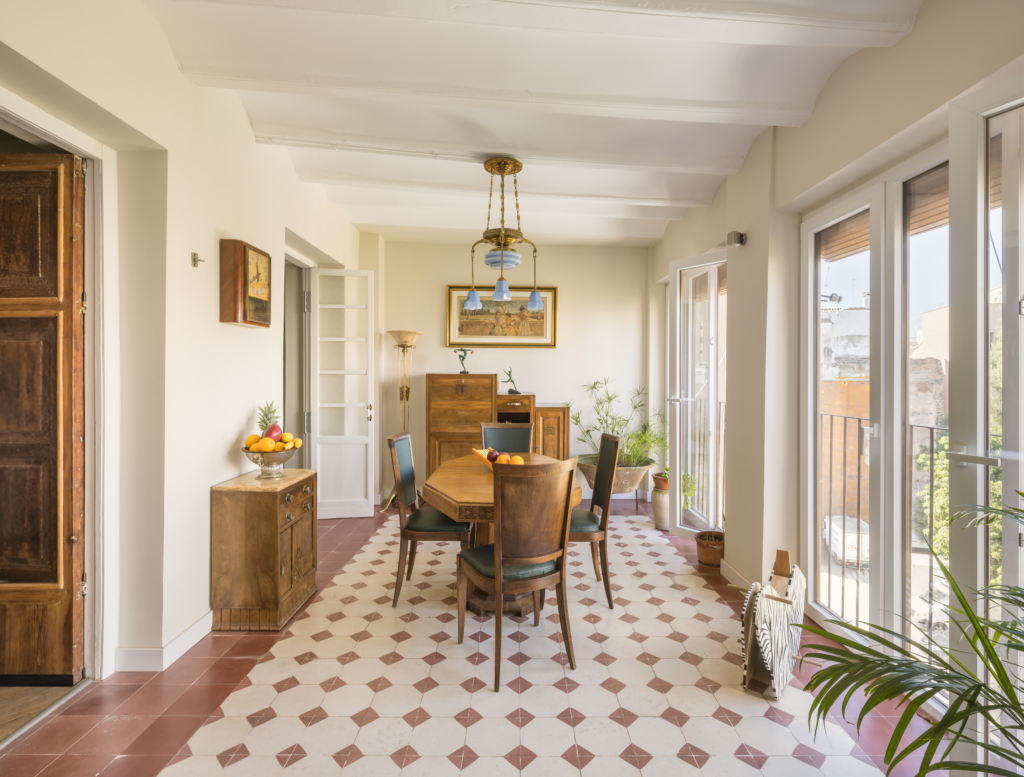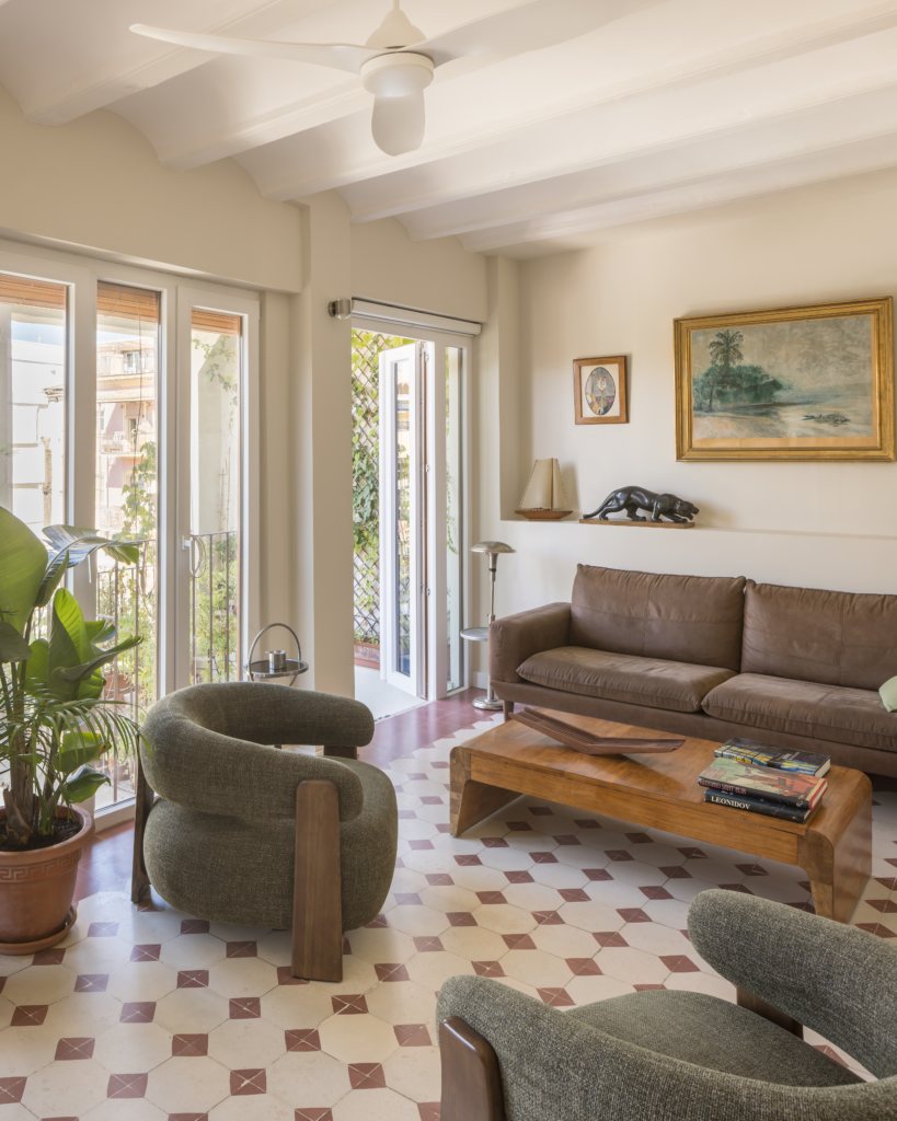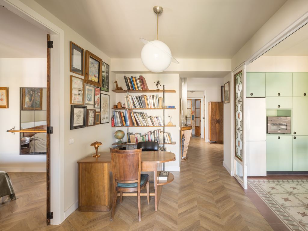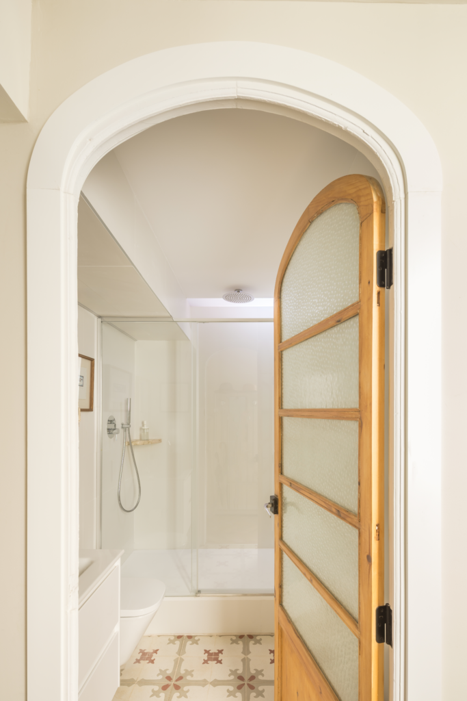 Desde el inicio, se apostó por recuperar y poner en valor los elementos originales de la vivienda. Los suelos hidráulicos, con sus colores vibrantes, se restauraron y se mantuvieron en el salón, la cocina y los baños. En los dormitorios y el estudio se optó por un suelo laminado en espiga, que armoniza con el conjunto y aporta confort. Los techos con vigas de madera vistas se conservaron para reforzar el carácter histórico de la vivienda, mientras que las puertas y sus marcos originales se decaparon y dejaron en madera vista, incluyendo también la restauración de las antiguas manivelas.
