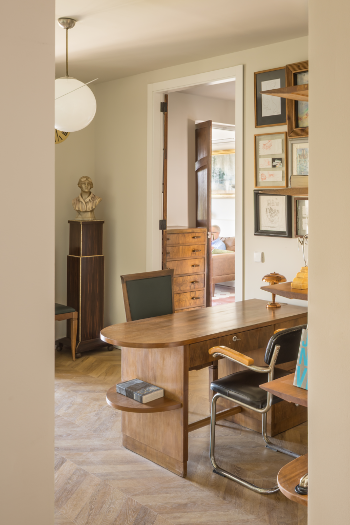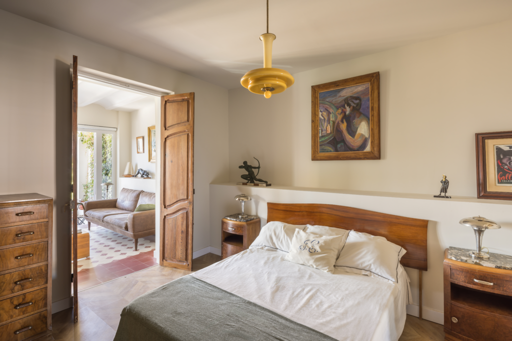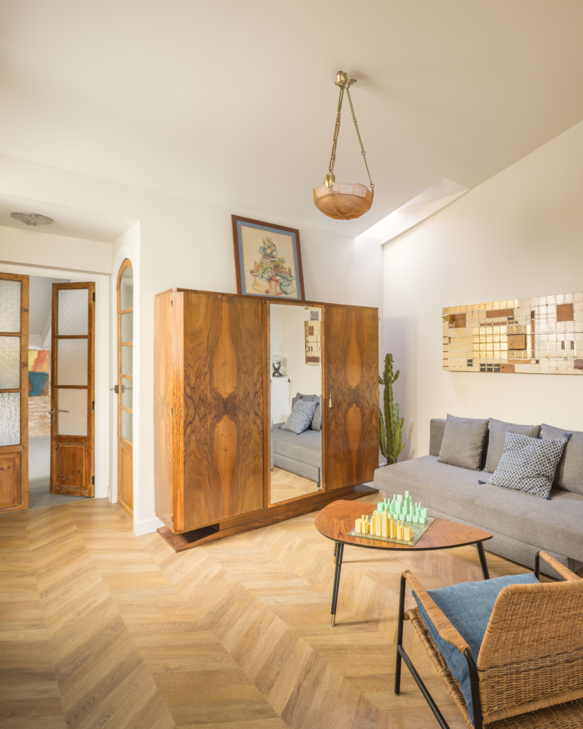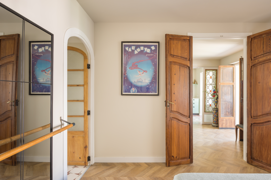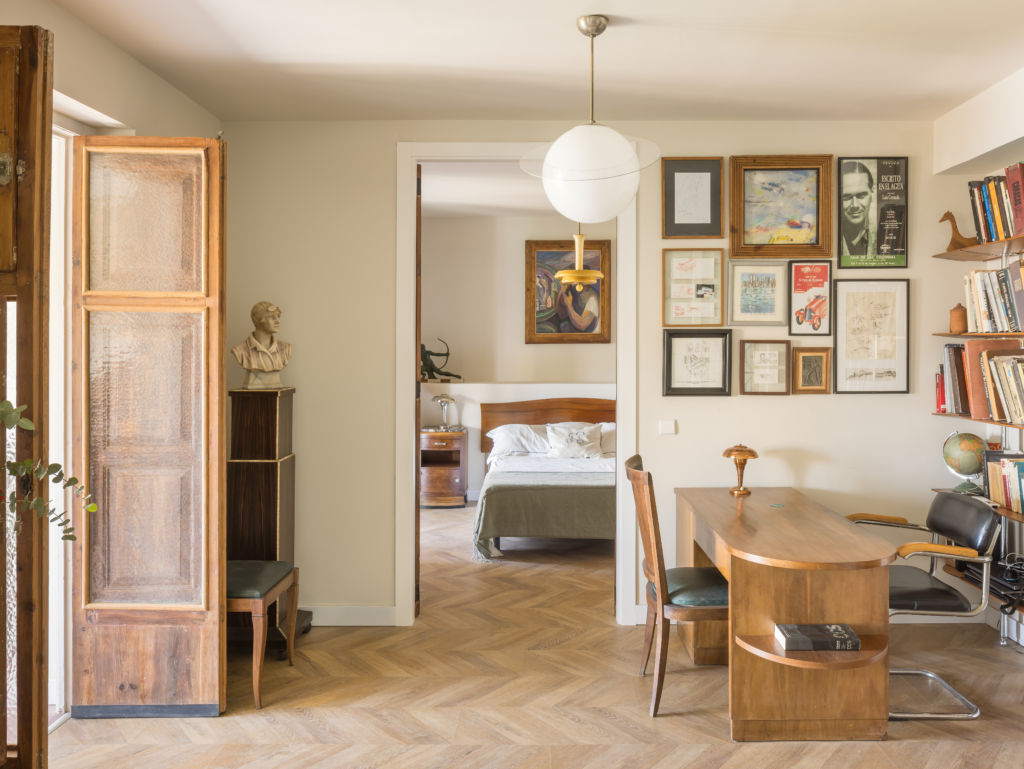Desde el inicio, se apostó por recuperar y poner en valor los elementos originales de la vivienda. Los suelos hidráulicos, con sus colores vibrantes, se restauraron y se mantuvieron en el salón, la cocina y los baños. En los dormitorios y el estudio se optó por un suelo laminado en espiga, que armoniza con el conjunto y aporta confort. Los techos con vigas de madera vistas se conservaron para reforzar el carácter histórico de la vivienda, mientras que las puertas y sus marcos originales se decaparon y dejaron en madera vista, incluyendo también la restauración de las antiguas manivelas.
