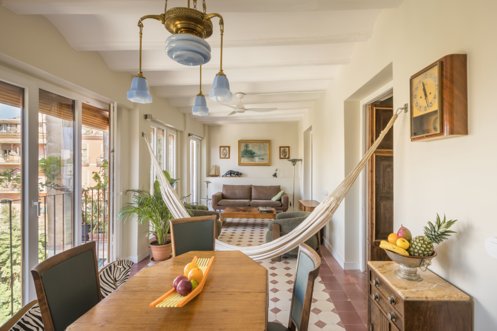 La antigua vivienda presentaba una distribución muy compartimentada, con estancias pequeñas y escasa entrada de luz natural. La reforma reconfiguró completamente la organización interior, situando el salón-comedor como pieza central del hogar. Este espacio se abre mediante ventanas balconeras al patio de manzana, un entorno tranquilo que amortigua los sonidos urbanos y permite una ventilación cruzada que recuerda a las antiguas galerías tropicales, una imagen muy presente en el imaginario de los propietarios. La cocina se diseñó como un espacio abierto al despacho, que a su vez actúa como distribuidor hacia la habitación principal, permitiendo que la luz de las balconeras bañe también estas estancias. Los baños se ubicaron en zonas más alejadas de la fachada principal, garantizando privacidad sin comprometer la funcionalidad.