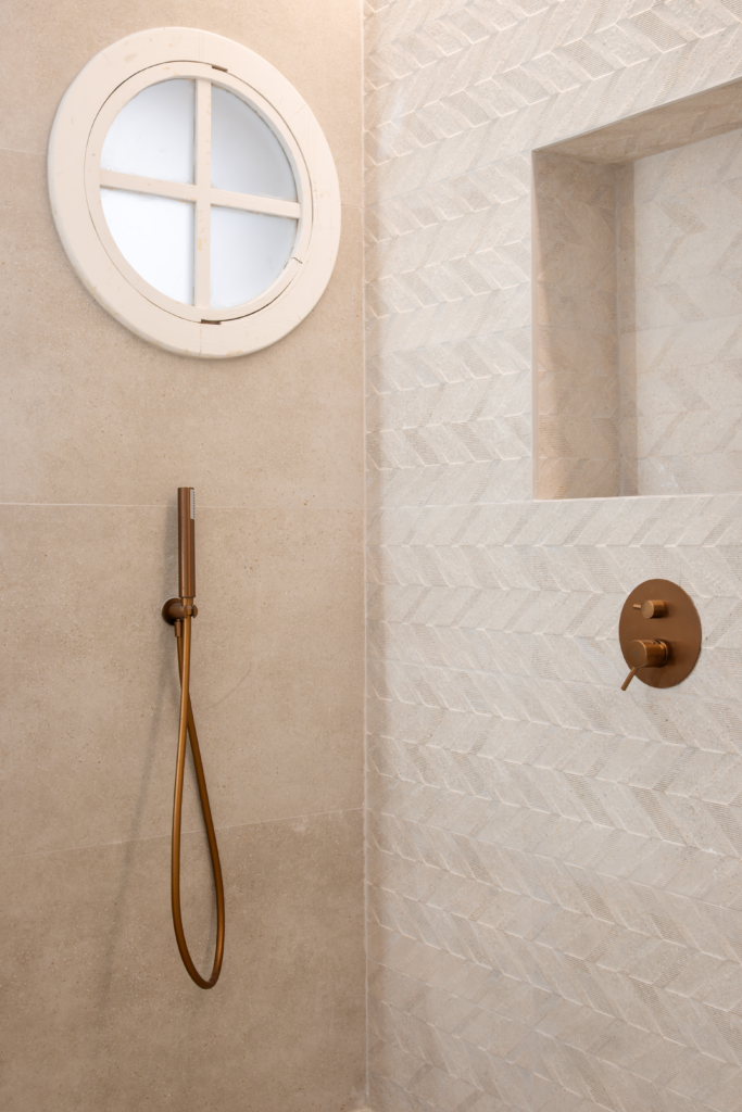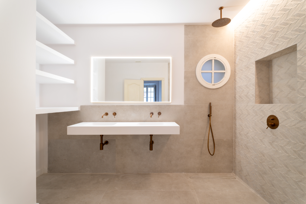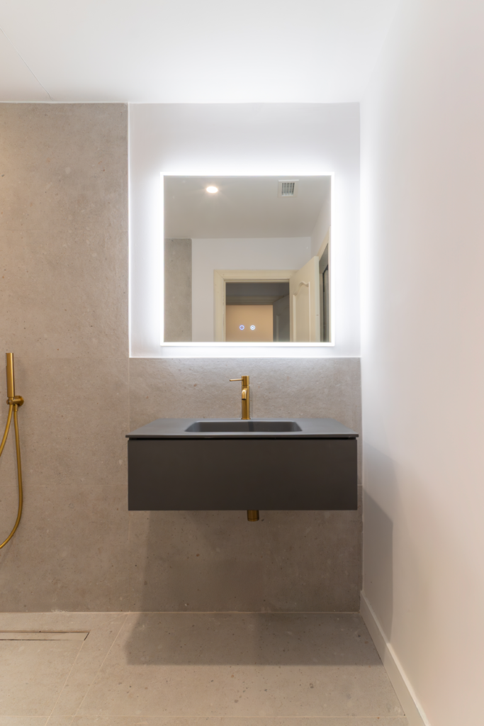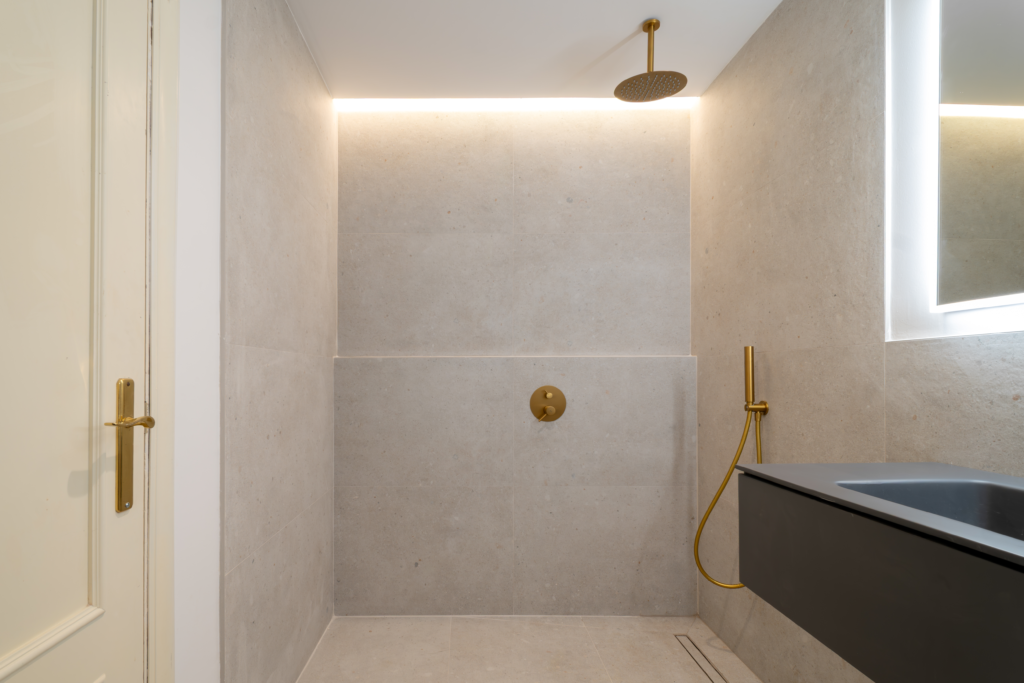 En los baños se buscó continuidad visual y espacial mediante duchas de obra en ambos espacios. En el baño principal se incorporó una estantería de obra que aporta funcionalidad y carácter, mientras que los detalles en acabado oro introducen un punto de elegancia que refuerza el estilo clásico contemporáneo del proyecto.