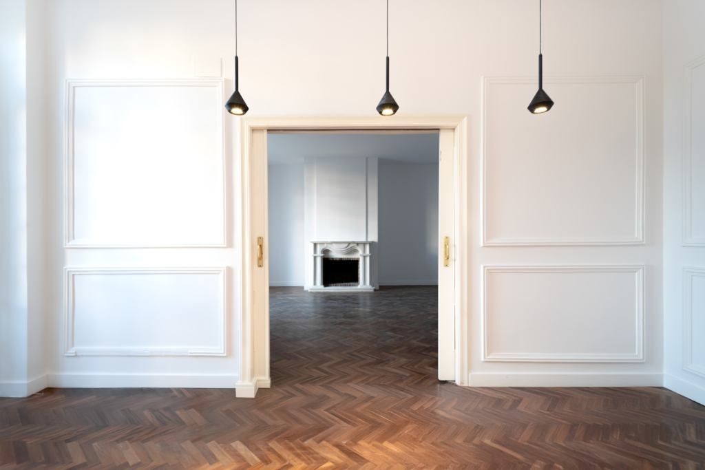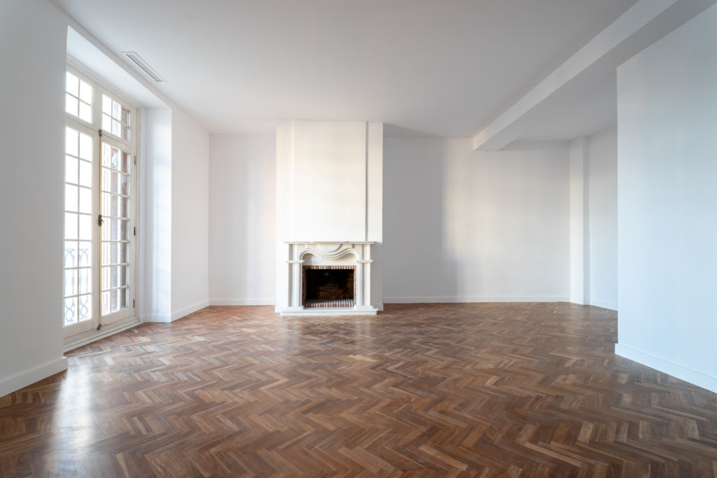 Desde el inicio, una de las prioridades fue recuperar la sensación de altura en los techos y conservar aquellos elementos que aportan identidad al inmueble. Se mantuvieron las molduras originales, las puertas y las ventanas de madera con travesaños, así como la chimenea, que continúa siendo un punto focal cargado de carácter y memoria. El pavimento de madera natural en palillería, colocado en espiga con pieza pequeña, se conservó y se trabajó para aclarar su tono y lograr un acabado mate, reforzando la luminosidad y la elegancia del conjunto.