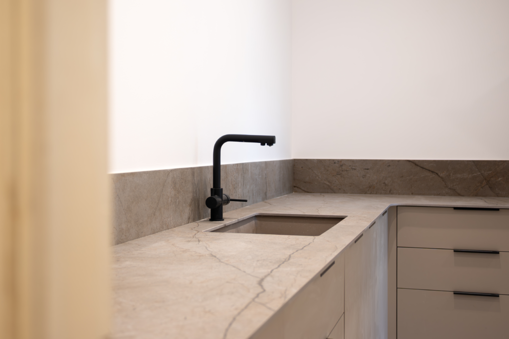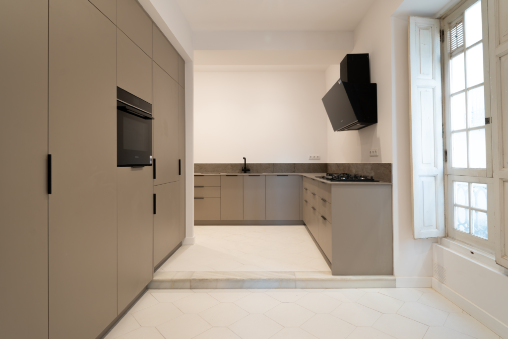 La cocina se planteó como un espacio contemporáneo claramente diferenciado, organizado en dos áreas muy definidas: una zona de trabajo con encimera y una zona de almacenamiento mediante columnas. El diseño apuesta por tonos térreos y una estética sofisticada, con una encimera de porcelánico que imita el mármol natural en matices inspirados en el cacao y el café, logrando un equilibrio entre modernidad y calidez que dialoga con el resto de la vivienda.